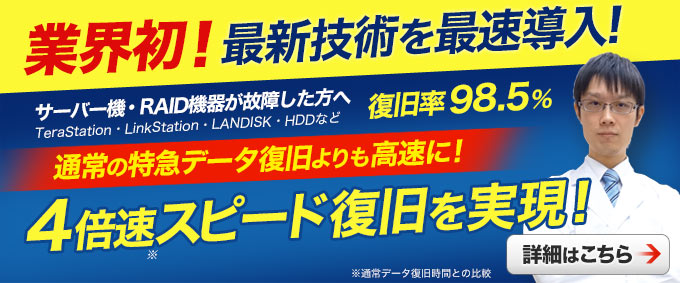 | データ復旧の結果 | LinkStationから90%以上のデータ復旧に成功 |