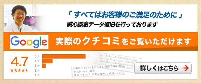 | お客様の声 | 2日でデータ復旧ができてよかった。データが戻らなかったらどうしようかと思っていたので本当に助かりました。 | ||